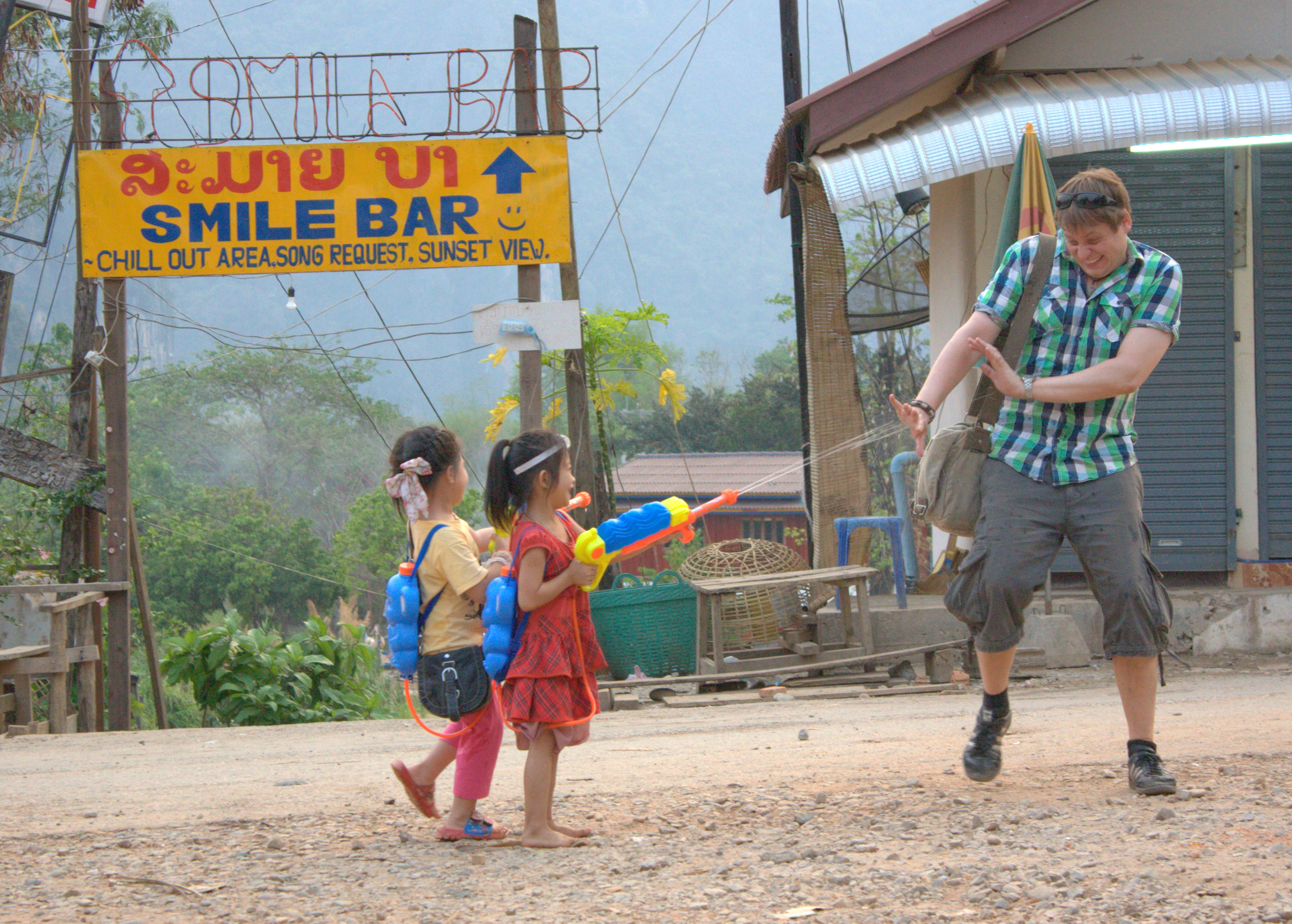 Hari pertama sih menyenangkan karena Vang Vien lagi panas-panasnya. Saking panasnya, sungai yang berada di salah satu sudut Vang Vien pun mengering dan bisa dilewati mobil. Begitu hari kedua kami udah mulai males kesiram air, apalagi air ini nggak bersih-bersih amat. Pas hari ketiga, udah BT aja lihat orang main air nggak selesai-selesai. Apalagi sebagai pemanggul ransel, kami nggak bawa banyak pakaian. Nggak cuma saya yang BT, pengemudi tuktuk pun ikutan ngamuk kalau disiram, apalagi pas ada yang menyemprotkan air berwarna.