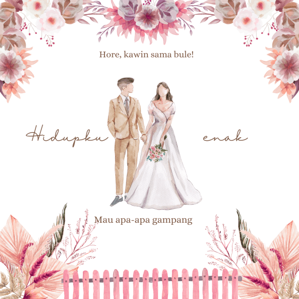 Banyak orang berpikiran pendek bahwa kawin sama bule itu enak, bisa hura-hura, uangnya gak ada nomor serinya. Kebanyakan lihat expat di Indonesia sih, jadi mikirnya begitu. Di Indonesia mah mereka jadi expat, ada allowance expat, rumah dibayarin, mobil dibayarin, gaji banyak kelebihan karena rumah dibayarin. Pulang kembali ke tanah airnya, belum tentu mereka bisa naik taksi tiap hari, mabok bayarnya.
