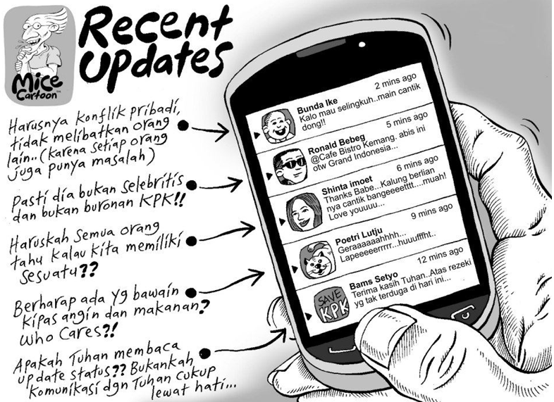 Sebenernya gak cuma pamer kekayaan yang bikin gerah-gerah gemes, tapi pamer berbagi kasih sayang di social media juga bikin gemes & bikin jidat mengeryit. Haduh padahal mengeryit ini bikin jidat kusut dan ongkos botox kan mahal. Catat lho ya bukan ngiri, tapi gemes. Ngobrol-ngobrol, nyapa pasangan lewat status. Nggak cuma pasangan sih, kasih ucapan terimakasih ke teman, atas makan siang, malam, atau bahkan oleh-oleh juga dipasang di status. Herannya lagi banyak yang berdoa di status. Tuhan itu emang Maha segalanya, tapi segitunya ya sampai permohonan untuk Tuhan pun harus di sharing di status?