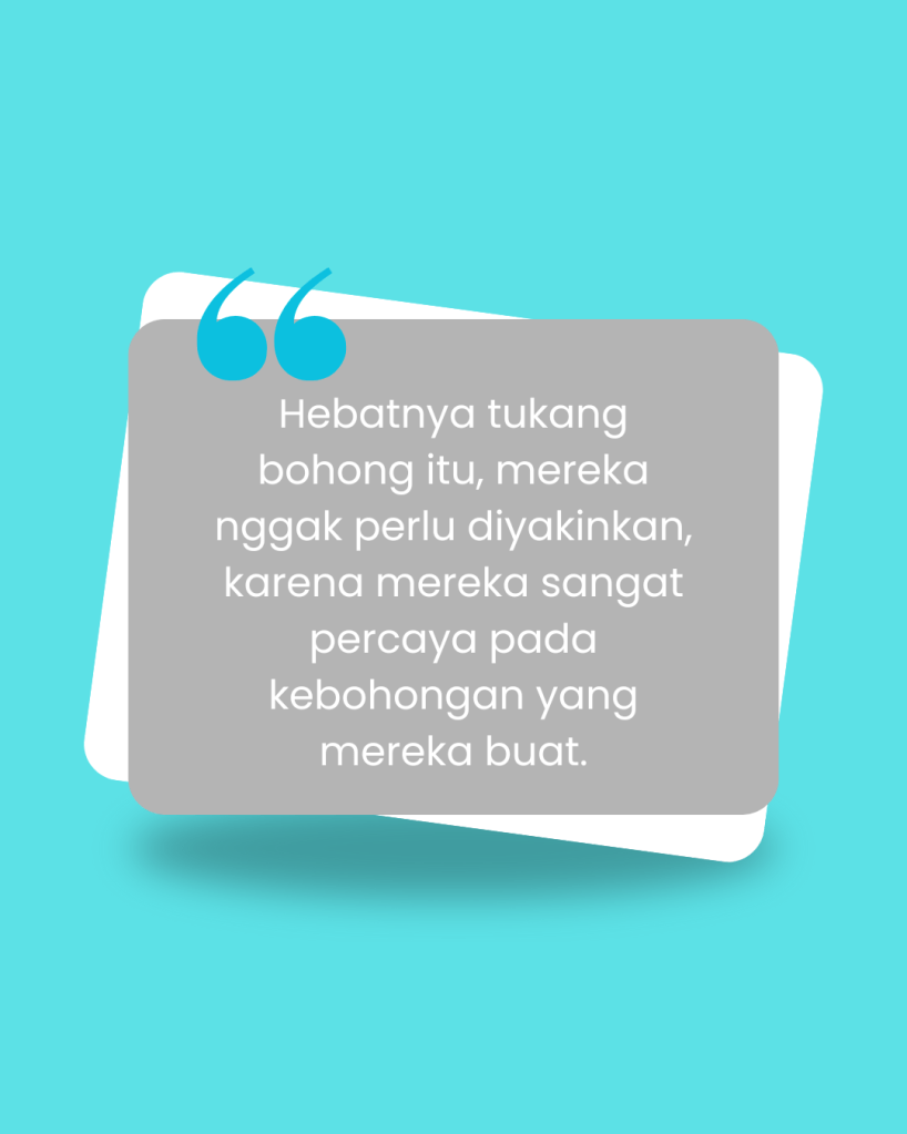 Beberapa tahun yang lalu saya pernah mengadakan sebuah “riset kecil” di google untuk bahan pembahasan makan siang. Gelo emang, mau ngobrol makan siang aja pakai riset dulu dan bikin rangkuman singkat sepanjang hampir dua halaman yang didistribusikan lewat Email. Topik makan siang saya saat itu: mythomania atau yang kerap disebut pathological liar. Entah apa terjemahannya di dalam bahasa Indonesia,mungkin pembohong kronis.